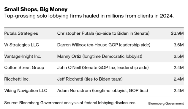 More than 50 solo shops reported revenue of $1 million or more last year, according to a Bloomberg Government analysis of federal lobbying disclosures, accounting for nearly $80 million in fees.